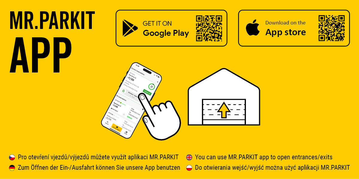 Stáhněte si aplikaci MR.PARKIT - rychlejší rezervace, snadná úprava nebo prodloužení, přístup do garáže tlačítkem v appce.