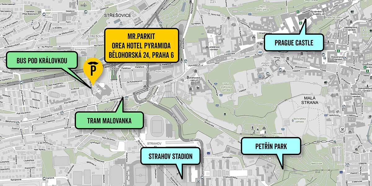 Pohodlné a rychlé parkování v lukrativní lokalitě v blízkosti Břevnova a Pražského hradu najdete na parkovišti Hotelu OREA Pyramida - Pod Královkou 6, které se nachází za hotelem. Jedná se o soukromé parkoviště hotelu OREA Pyramida.