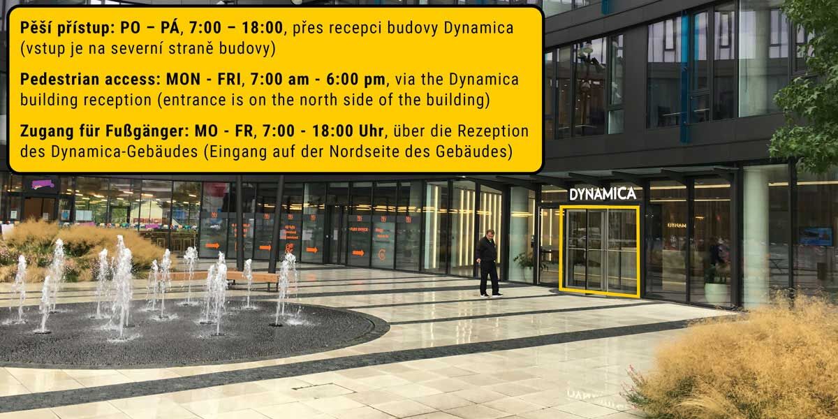 Pro pěší vstup použíjte východ přes recepci budovy Dynamica (Po-Pá 07:00-18:00). O víkendech a mimo pracovní dobu zvoňte na zvonek "velín" u vjezdu do garáže.